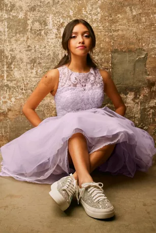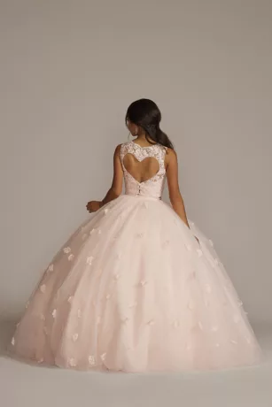A modern quince dream! Start the day in this three-piece quinceanera ball gown, then shed the top skirt, revealing a flirty, poofy tulle skirt underneath. Features a cropped tank with lace appliques and a heart-shaped keyhole back.