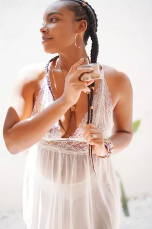 Featuring adjustable straps for a perfect fit, this chemise is detailed with a sheer lace bodice and a plunging neckline. Includes a matching pair of lace hipsters to complete the lingerie look for your wedding night or honeymoon.