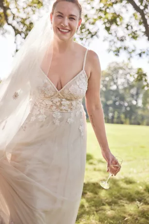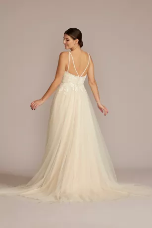 You’ll radiate romance with the floral lace appliqued bodice on this dreamy full length gown, complete with chapel train.