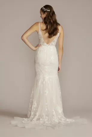 It’s hard to pick the most eye-catching detail of this dot net mermaid wedding gown. From the beaded lace appliques to the ruffle hem on the skirt, the plunging neckline to the stunning chapel train, you’ll bring the heat on your big day.