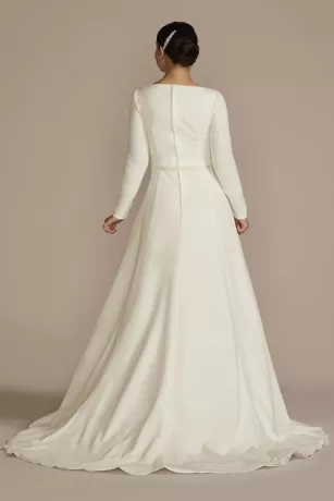 Say “I do!” to this belted crepe wedding dress. The high neck and long sleeves ensure modesty, while the chapel train and beaded belt at the waist brings a level of excitement.