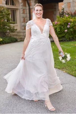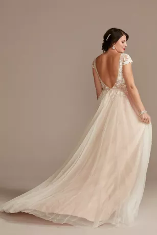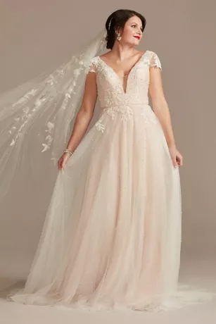 The soft romance of cap sleeves and a low back meets the timeless elegance of a V-neckline and full skirt in this pearl-covered tulle A-line wedding dress. Beaded lace appliques complete the look.