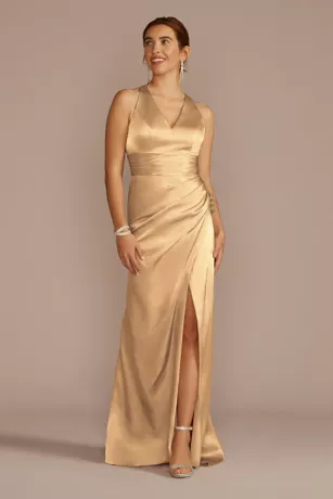 This bridesmaid dress stands out from the crowd with satiny charmeuse fabric, flattering draping, and a crisscross back complete with a streamer.