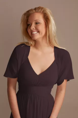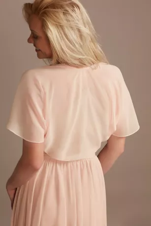 Lightweight and breezy, this soft chiffon bolero capelet with flutter sleeves is perfect for adding some coverage at a summer wedding.