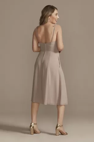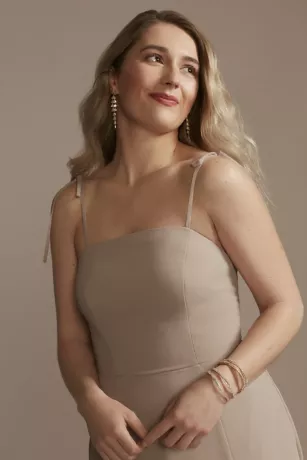 A modern midi bridesmaid dress with spaghetti straps that tie for the perfect fit. A skirt slit adds a flirty touch.