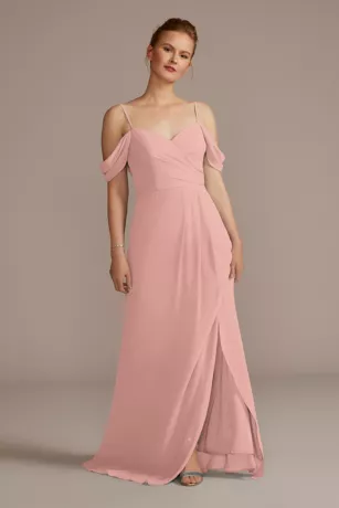 There are so many reasons to love this chiffon bridesmaid dress! Swag sleeves, a cowl back, and a skirt slit, to name just a few.