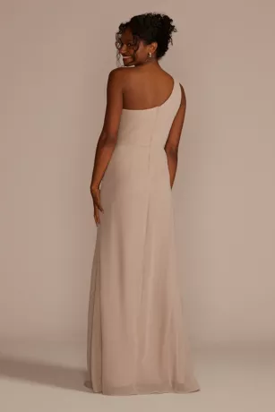 An asymmetric bodice is complemented with the cascading ruffle and skirt slit on this intriguing chiffon bridesmaid dress.