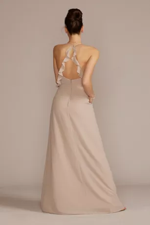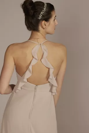 The sweetness of ruffles combines with a statement back on this modern chiffon bridesmaid dress. Did we mention it has pockets?
