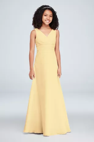 This soie chiffon junior bridesmaid dress features a surplice bodice and cummerbund-style waistband. Its flowy skirt is ideal for sashaying across the dance floor.