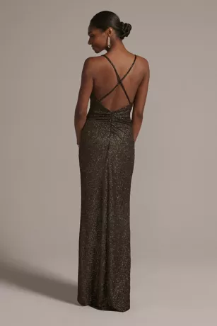 Have your main character moment in this metallic glitter knit dress. With details that accentuate your figure like a cowl neck, formfitting draping, and a thigh-high slit, the occasion is yours to own.