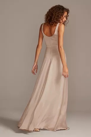 Radiate modern glamour in this clean-lined, crepe-back satin scoop tank bridesmaid dress with flattering bodice seams, a sleek overlay, and a sexy skirt slit. Handy side pockets are an easy place to keep lip gloss or emergency bobby pins.