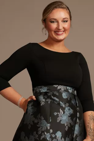 A sweeping floral skirt steals the show on this elegant ball gown, making it a sophisticated and chic choice for any mother of the bride or groom.