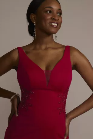 Simply seductive, this crepe sheath gown is all about the glam, thanks to illusion embellished lace detailing at the waist, intricate beaded trim on a gorgeous open back, and a sexy thigh-high slit.