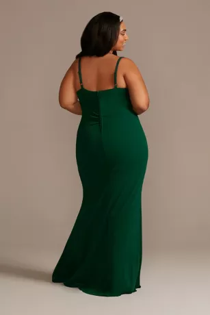 You’ll be ready to celebrate anything in this crepe gown with spaghetti straps, flattering ruching, and a side slit.