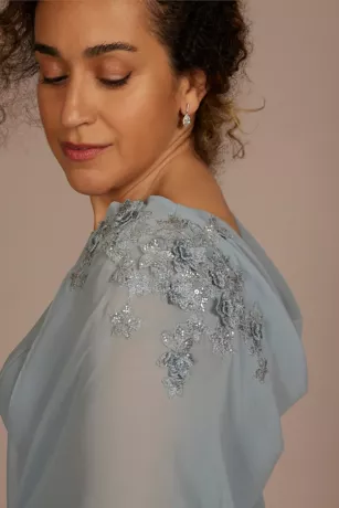 Live like royalty in this tank-style sheath dress made with crepe fabric that hugs your figure in all the right places. Perfect for the mother of the bride or groom, this look comes complete with a removable chiffon capelet that sparkles with sequin and floral appliques.