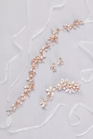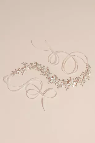 This lovely floral sash lends a vintage-inspired vibe to your look with its brushed petals and crystal and pearl accents. Finished with organza ribbon.