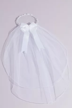 This sweet communion veil is detailed with a wreath of daisies, two layers of airy tulle, and a shiny satin bow.