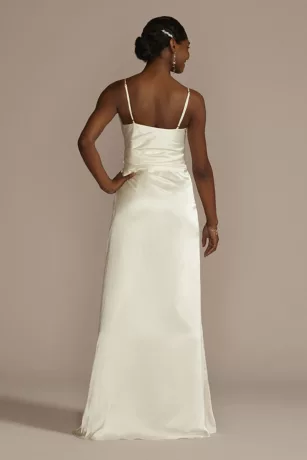 Both classically sexy and undeniably elegant, this satin wedding dress is full of beautiful details like a draped surplice neckline, fabric-covered buttons at the asymmetrical waist, and dainty adjustable spaghetti straps.