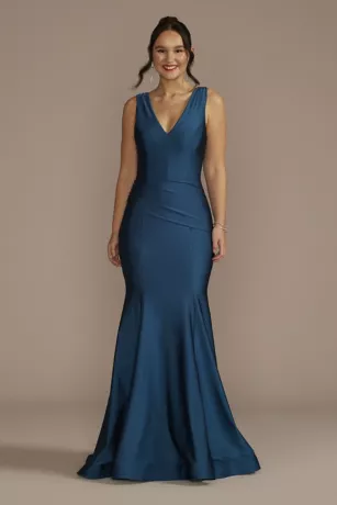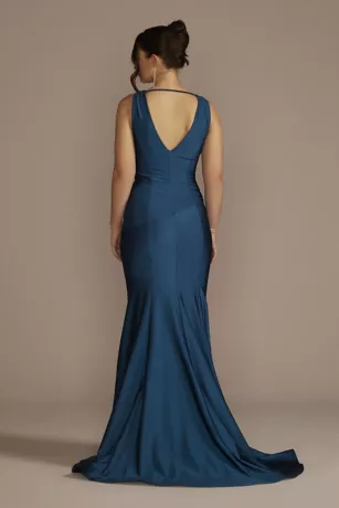 Serve elevated elegance in this sleek mermaid dress designed with stretch satin to highlight and hug your figure. Memorable details like the draped bodice, sexy open back, and dramatic train ensure all eyes will be on you.