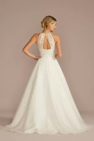 An embellished, sparkle illusion fabric halter neck bodice is a fresh take on bridal style. Paired with a sparkle detail waistband atop a full A-line skirt and interesting keyhole back detail, you’ll steal the show when you say “I do.”