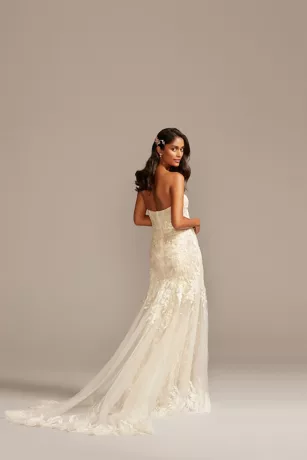 Embellished with embroidered appliques and sequins, this lace wedding dress exudes sultry sophistication. The strapless, lingerie-inspired corset bodice has bustier-style cups and grosgrain-covered boning detail for added structure. The curve-hugging silhouette flares into a trumpet skirt, with layers of textured florals and vines cascading into a chapel train, and is finished with leaf-embellished trim along the hem.