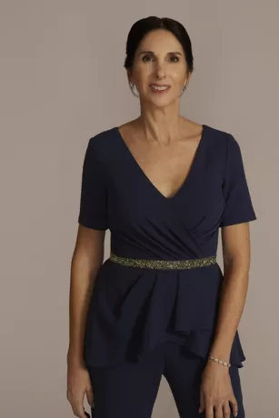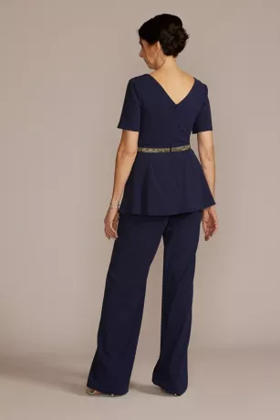A flirty ruffled peplum adds an unexpected flair to this crepe jumpsuit’s structured silhouette. Straight leg pants lengthen your frame, while an embellished waist detail glimmers at your smallest point.