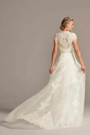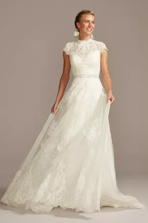 Ornate lace and floral applique is layered atop illusion mesh and tulle to form this modern heirloom wedding dress. The vintage-inspired appliques create a high mock neckline, while eyelash-trimmed scallops adorn the cap sleeves and A-line skirt. Finished with a chapel train.