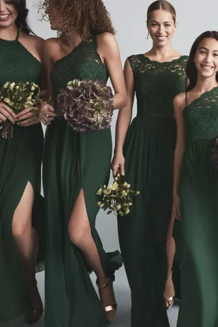 Illusion one shoulder corded lace bodice with ribbon belt at waist. The Long mesh skirt features a slit and is comfortable and easy to move in.