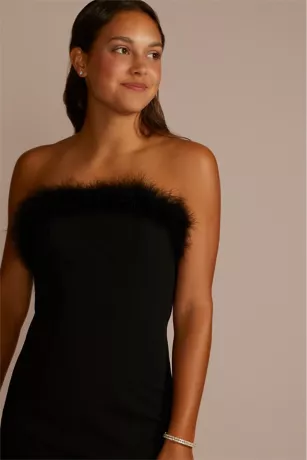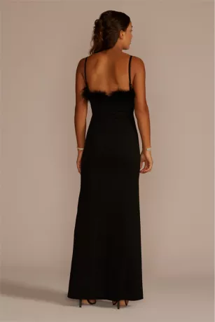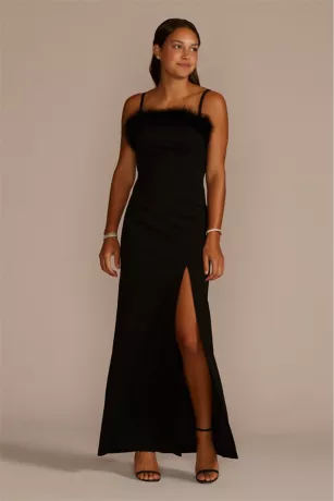 Sleek yet anything but simple, this luxe sheath dress will solidify your spot as the class trendsetter. Debut this feather-trimmed number, complete with a thigh-high slit, at prom, and you’ll have everyone talking. Detachable straps add versatility to your look.