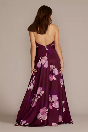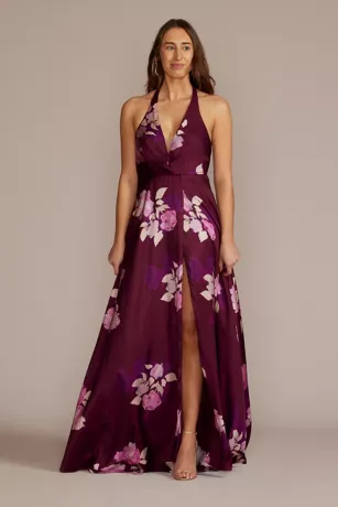 Bring the heat in this printed halter dress, perfect for every party this summer. Groups of radiant florals jump off charmeuse fabric, creating an irresistible slit-accented A-line.