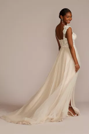 A stunning floral applique bodice rests at your natural waist before spilling into a soft tulle skirt. The front slit creates motion with every step.