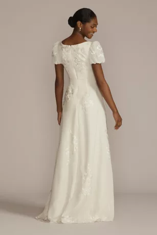 Your search for the perfect boho wedding dress is over! From the flowing skirt and puff sleeves to the allover floral appliques, each intricate detail of this V-neck, empire waist wedding gown is a call to nature and its unmatched beauty.