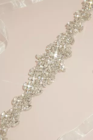 Bloom brightly on your big day with this sparkling sash, featuring organza ribbons topped with flower-shaped clusters of crystals.