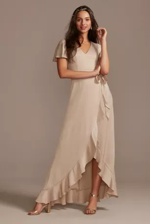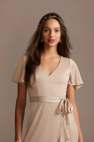 Crafted of crepe-back satin, this bridesmaid dress has a luminous shine from the flutter sleeves to the V-neckline to the ruffled skirt hem. A tie at the waist adds the finishing touch.