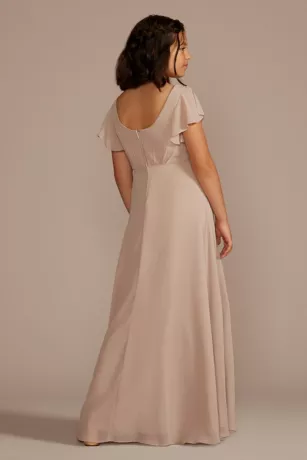 From the softly pleated, V neckline to the billowy, floating full circle skirt, this long chiffon junior bridesmaid dress gives a dreamy aura. The faux-wrap style bodice is finished with soft flutter sleeves.