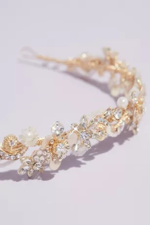 Taking botanic inspiration, this headband is covered with blooming flowers made from various crystal, bead, pearl, and metallic arrangements. The piece is finished with delicate wire swirls and decorative scrolls.