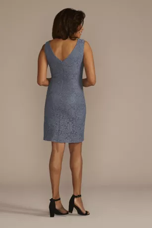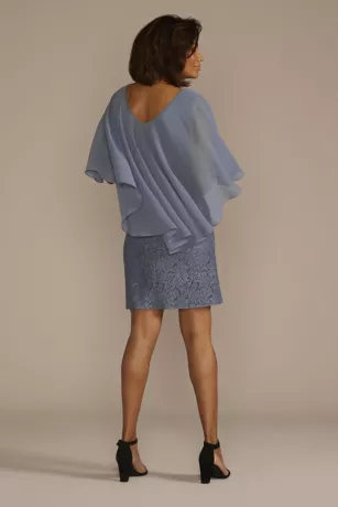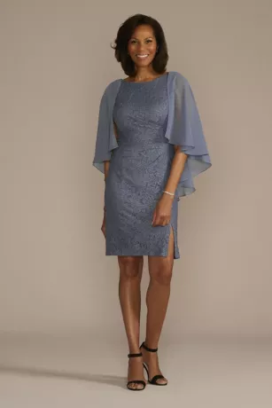 An elegant option for Mom’s upcoming special occasions, this gorgeous set features a glitter lace sheath dress, designed with a subtle slit and removable floating chiffon capelet.