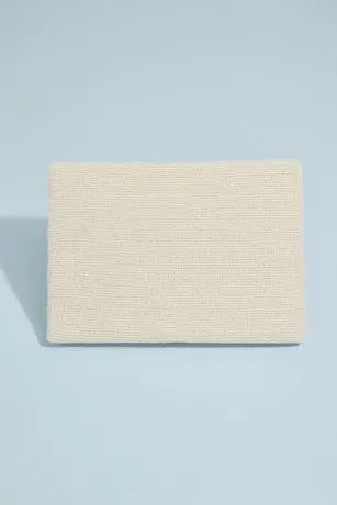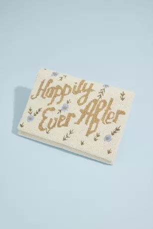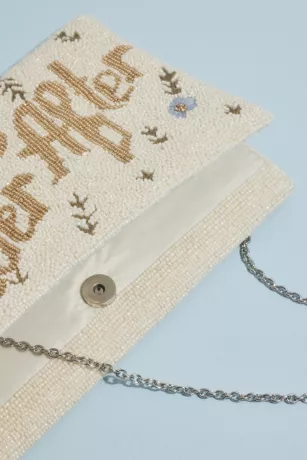 This cute clutch spells out “Happily Ever After” in golden beading on an allover ivory beaded background, sprinkled with blue flowers and green stems.