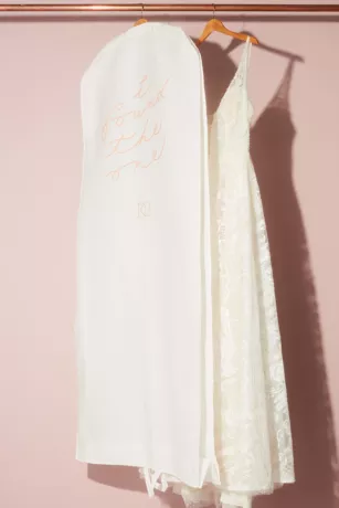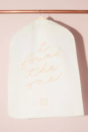 Perfect for your wedding dress or any special ensemble, this roomy reusable garment bag is designed to accommodate even the fullest of gowns. Featuring our signature “I found the one” script, the bag is crafted of durable, non-woven fabric and is finished with a reinforced hanger hole, bottom loops for easier gathering and carrying, and a clear vinyl accessories pocket.