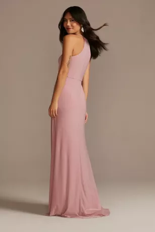 On this jersey spaghetti strap bridesmaid dress, it’s all about the flattering bodice knot and the fun skirt slit.