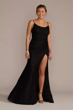 A glamorous side-drape detail, cowl neckline, and high skirt slit make this lace bridesmaid dress an extra alluring choice. Features bra cups.