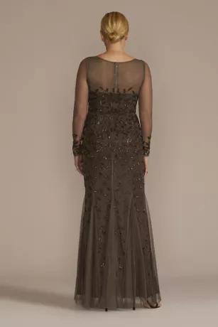 Opulent beading artfully embellishes this sheath dress, but leaves an especially memorable mark on the illusion neckline and sleeves. The godet hem skirt adds volume to your every move.