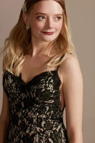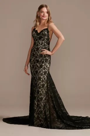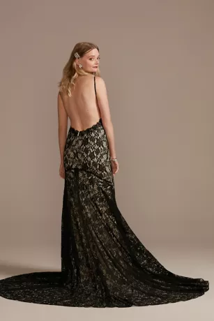 This form fitting and figure flattering eyelash lace sheath dress swoops low at the back, as a lace train trails weightlessly behind.