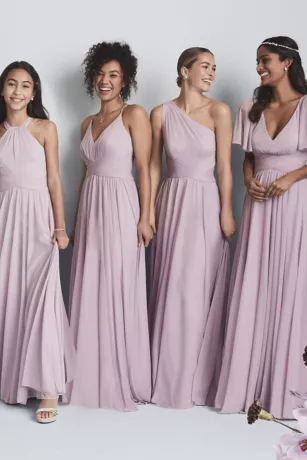 Delicate spaghetti straps and a sleek racerback give this mesh bridesmaid dress a modern feel. A figure-flattering pleated crisscross waistband and a full, soft skirt complete the look.