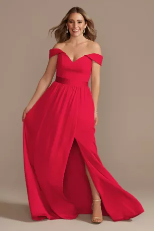 A modern bridesmaid dress full of thoughtful details, this off-the-shoulder A-line features moss crepe bodice, matte charmeuse full envelope skirt, high slit, and pockets.