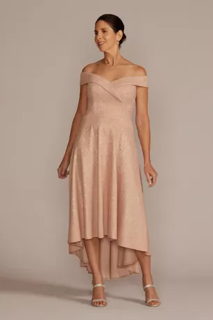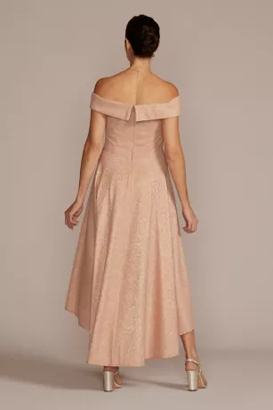 Feel like royalty in this overlapping off-the-shoulder dress featuring a timeless high-low skirt and opulent metallic fabric. A refined look for any mother of the bride or groom.