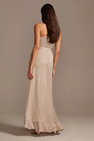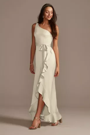Crafted of crepe-back satin, this bridesmaid dress has a luminous shine from the one-shoulder neckline to the ruffled skirt hem. A tie at the waist adds the finishing touch.