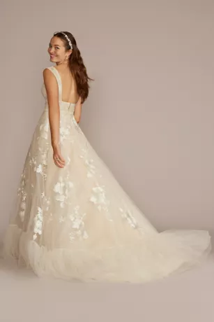 Take a spin (or two!) in this stunning tulle and organza gown with a flirty shirred hem, beautifully decorated with 3D floral appliques. A plunging V-neckline and crisscross back sharpen the overall look for something that’s totally eclectic and totally you.