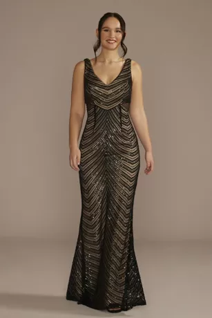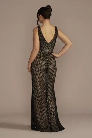 Brilliant linear sequins shape this mermaid tank dress for a glam party-ready look. Illusion side cutouts add a sexy touch.