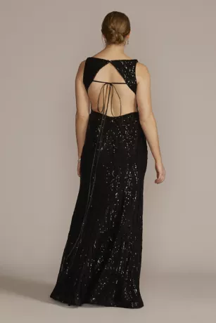 Catch light and attention in this sequin-adorned mermaid gown. A flirty lace-up back detail completes the look.